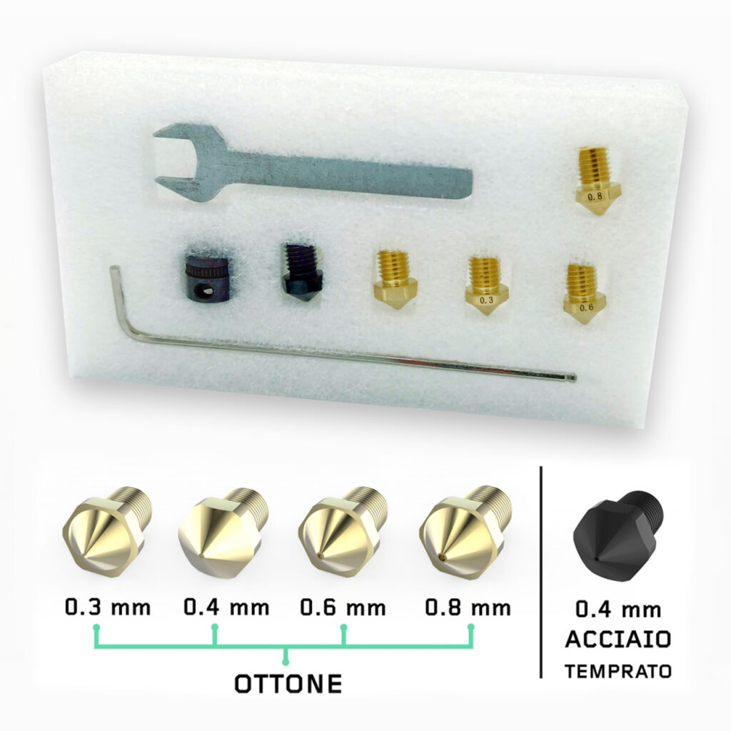 - 1 x Ugello in acciaio temprato da 0.4mm di diametro